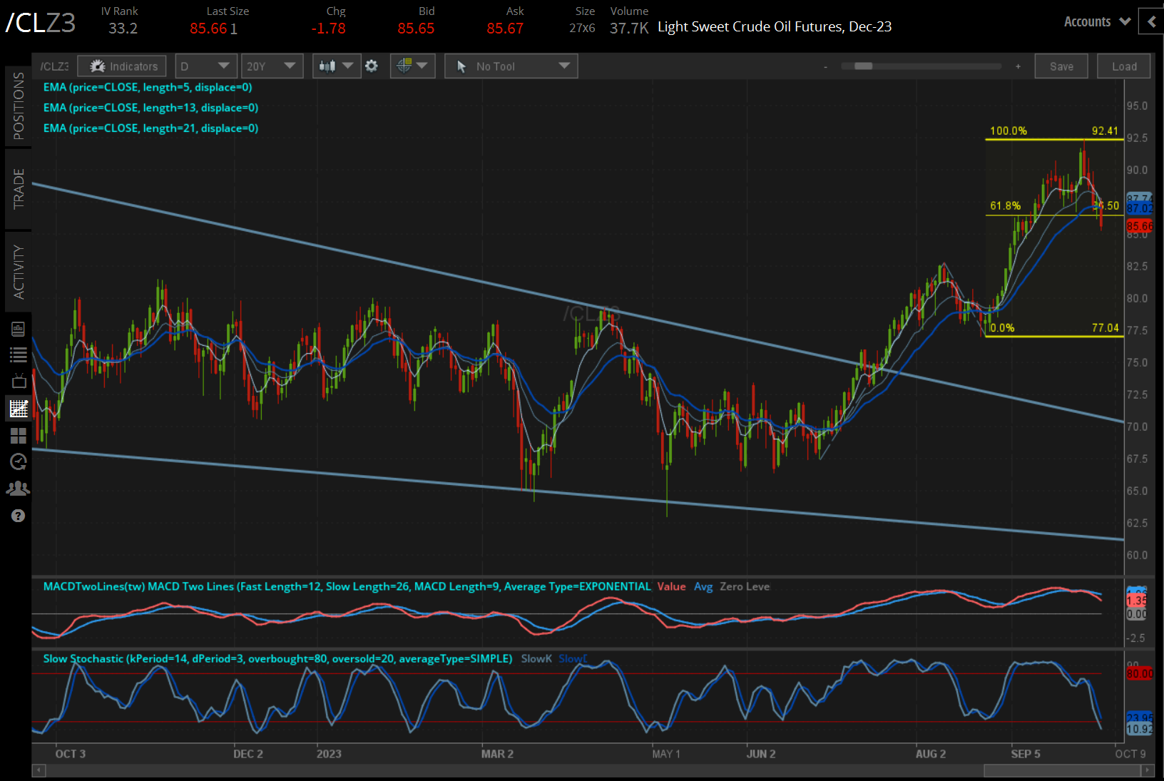 Crude oil futures (/CLZ3) remain in retreat, having broken through last week’s lows. It's the strongest sign that the recent uptrend is losing its luster. But the uptrend from the June and August swing lows doesn’t come into play until 85 or so, leaving open the possibility that the recent retrenchment is mere profit-taking following the sharp summer run higher. Coming into this week, net-long positions held by speculators in the futures market was at its highest level since March 2022.