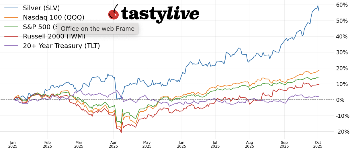 Year-to-date price percent change chart for SPY, QQQ, IWM, SLV, and TLT.