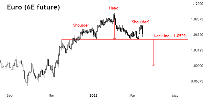 The 6E future tracking that exchange rate now appears to be carving out a bearish Head and Shoulders (H&S) pattern on the daily chart. A convincing break below the neckline at 1.0529 would confirm the setup, implying a measured move lower toward the parity threshold (where the Euro and the US Dollar trade 1-to-1). Invalidating the pattern seems to demand that the single currency re-establish a foothold above 1.0840.