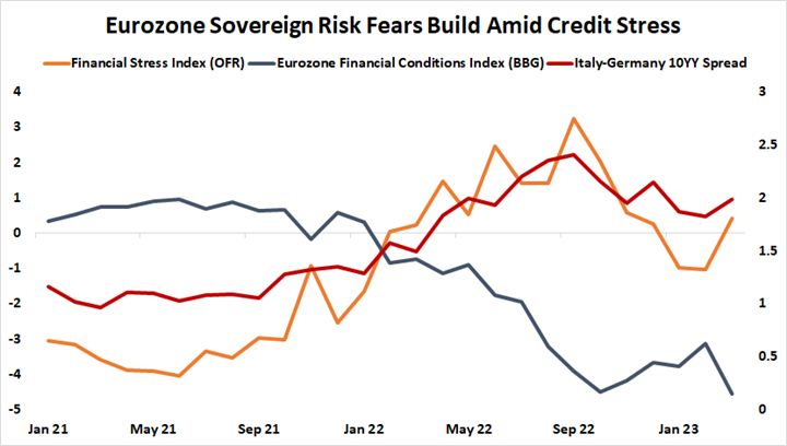 Sovereign risk adds a further dimension. The pick-up in credit stress has brought with it the dreaded widening of the bond yield spread between Germany – considered the Eurozone’s model of fiscal responsibility – and debt-laden Italy. Financial conditions have tightened as markets quake and lenders hoard cash, which has revived insolvency fears in southern Europe. Italy is both the largest and arguably slowest to deal with its debt load among the troubled member states.