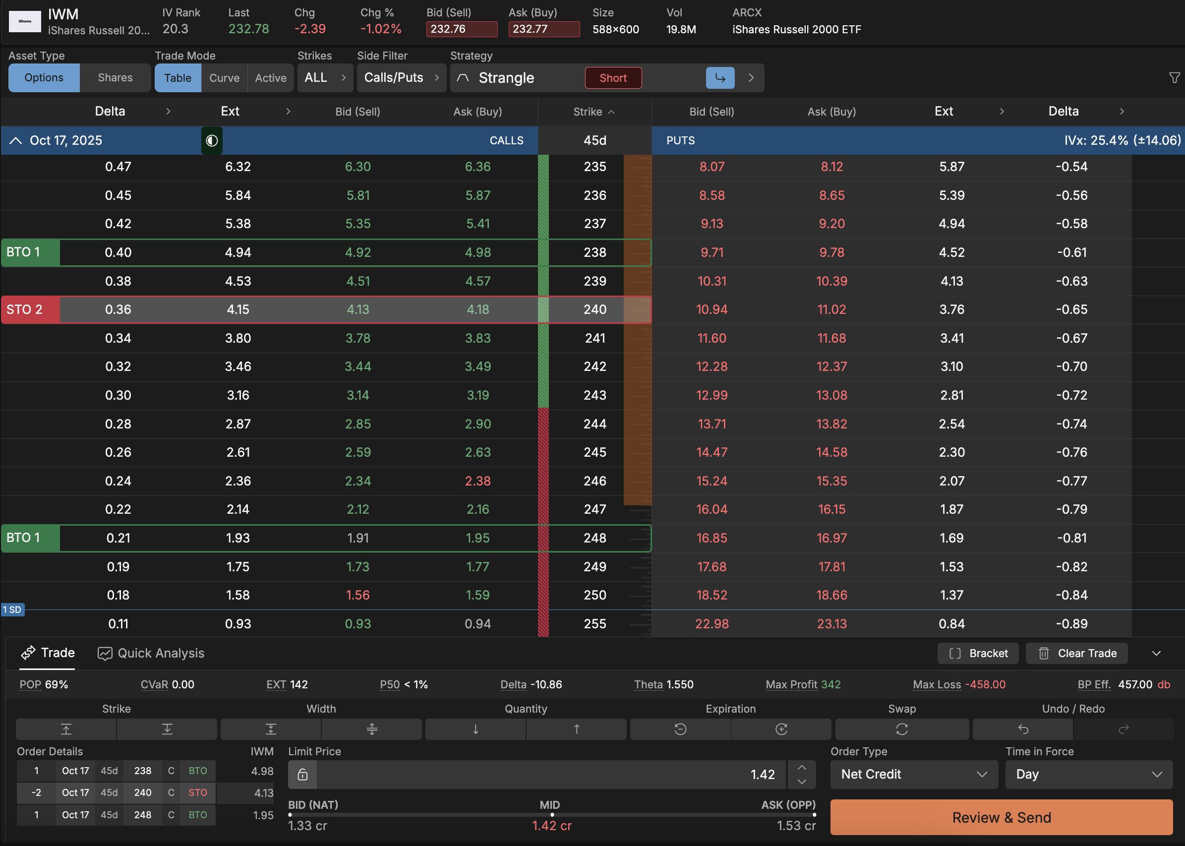 Small caps have shown strength with IWM trading at $232.74 and implied volatility at 21%. With no downside risk and a max profit of $342 possible if IWM pins at $240 at October expiration, this broken wing butterfly offers an asymmetric risk/reward. The trade structure - buying 1 IWM 238 Call, selling 2 IWM 240 Calls, and buying 1 IWM 248 Call (all Oct-17 45 DTE) - creates a neutral to bearish position that profits in the $240 zone while limiting risk to just the $1.42 debit paid.