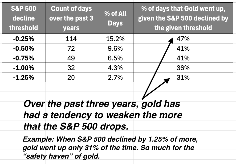 The takeaway? As the S&P 500 declines deepen, gold is less likely to rise. In other words, gold’s “safe haven” hasn’t played out over the past few years.