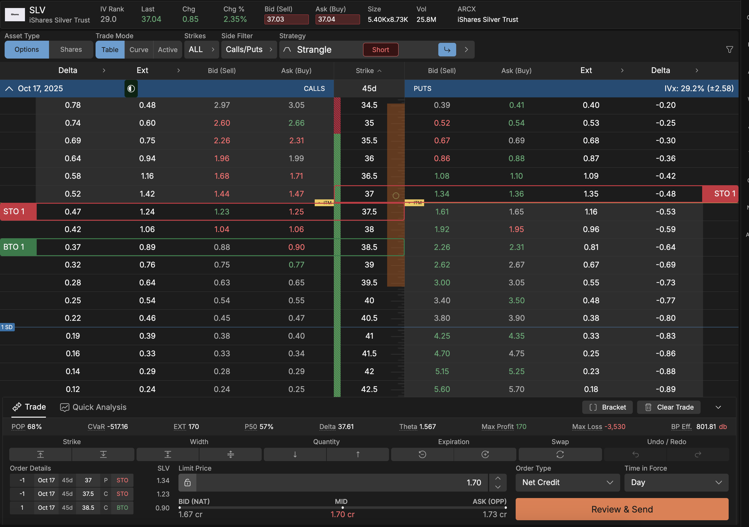 SLV ($37.04) Jade Lizard (OCT) $1.70 CreditWith SLV trading at $37.04 and implied volatility at 29.2%, this jade lizard collects $1.70 in premium by selling the Oct-17 37 Put for $1.33, selling the Oct-17 37.5 Call for $1.23, and buying the Oct-17 38.5 Call for $0.90. This bullish to neutral position has a 68% probability of profit with max profit of $170 if SLV stays between the short strikes at expiration. The trade has no upside risk above $38.50 due to the long call protection, while the max loss of $3,530 would occur on a significant downside move. With theta of 1.557 and 45 days to expiration, time decay works strongly in your favor.