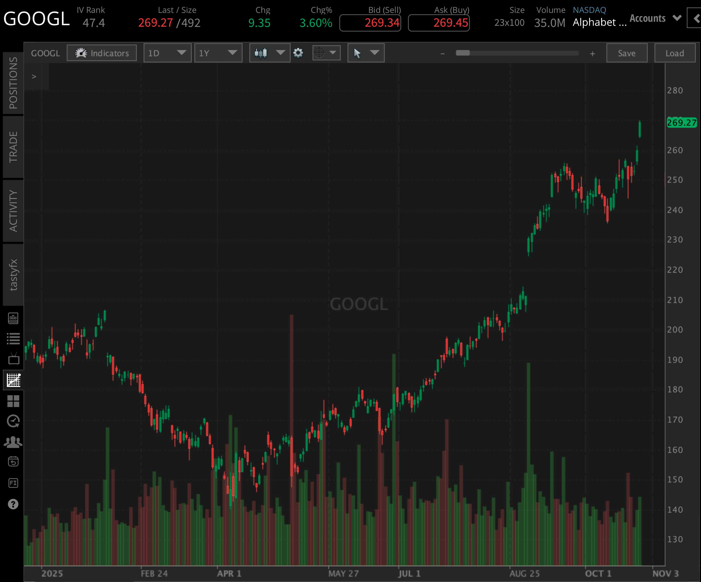 The markets were off to a hot start on Monday, with the S&P 500 and Nasdaq up well over 1%. While this isn't always a precursor for what's to come, it's certainly a welcome sight for traders & investors that want to participate in Mag 7 earnings reports this week in more calm markets. Google is expected to report an earnings-per-share of $2.28 on $99.9 billion in revenue. You heard that right - almost $100 billion in revenue for a quarter - what a staggering & historic figure we may get to witness! GOOGL stock opened the trading year at $190.65, and currently sits at $269 per share. Alphabet was not out of the woods during the tariff turbulence in April though, as the stock price dropped as low as $140.53 before making a momentous comeback to the annual high we're seeing now.