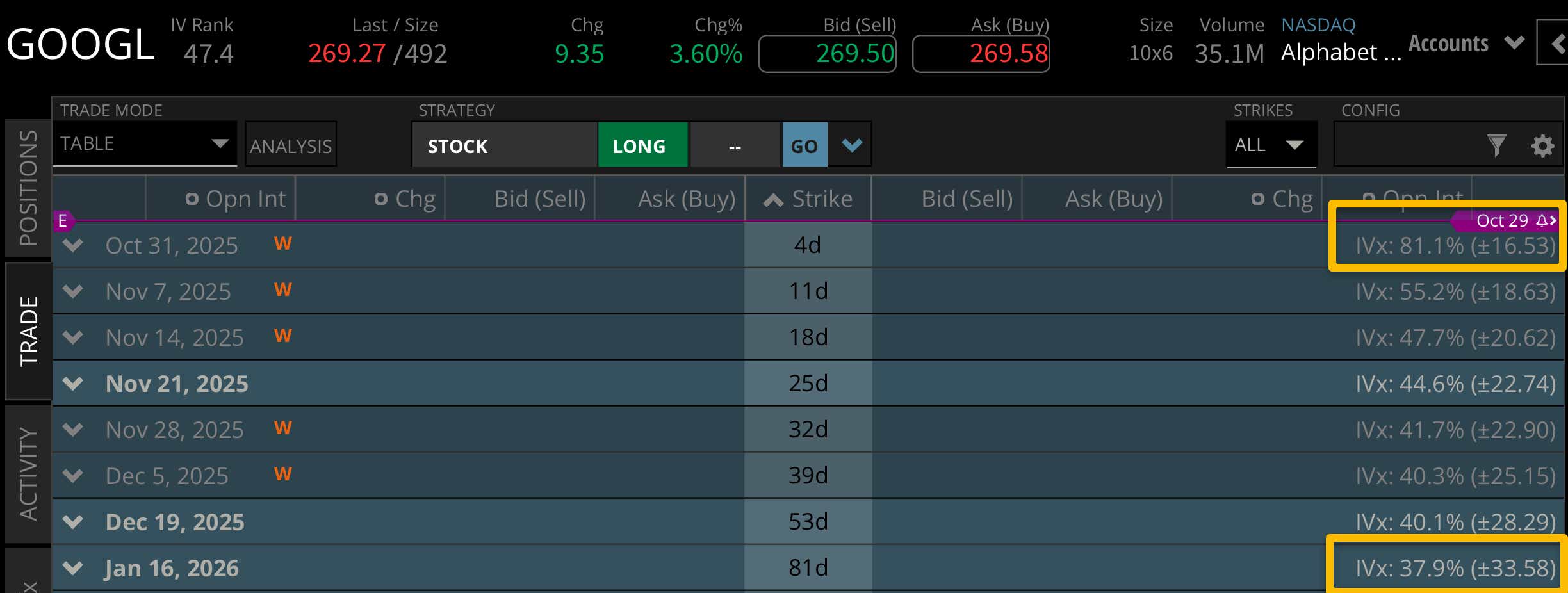 Based on current implied volatility, we're looking at a 6% stock price range for Alphabet's upcoming earnings announcement. This is on the lower end for most companies that fall between the 5-10% notional value range. With that said, we are only seeing a +-$33.58 implied stock price move through January 2026, so the earnings report this week makes up almost 50% of the implied range through the end of this year.