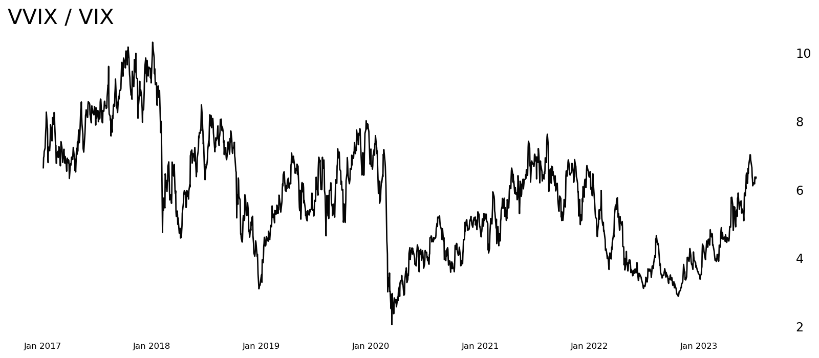 These low levels are reminiscent of the 2017 trading year in which the VIX saw a high of 17.28 and a low of 8.56, both intraday numbers, along with a yearlong average of 11.75. The lack of volatility and its potential trajectory can best be viewed in the chart above. Dividing the volatility of the VIX (VVIX index) by the VIX index itself immediately displays the level of fear (2020) or complacency (2017) in the market.