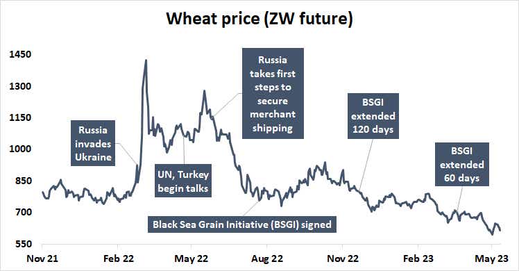 Russia’s invasion of Ukraine may reclaim the spotlight for investors ahead of a looming deadline to renew the Black Sea Grain Initiative (BSGI). The UN- and Turkey-sponsored scheme is meant to allow safe passage for Ukrainian grain exports to global markets in wartime without Russian molestation. It is up for renewal on May 18. Moscow has variously signaled that it may not re-up its commitment.