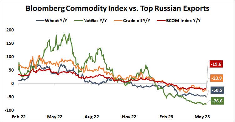 Thankfully, it seems this version of the future is unlikely, at least for now. The Kremlin’s saber-rattling may reflect a desire for a short-term price pop, but it seems likely to renew its BSGI commitment. In fact, keeping commodities where Russia is a dominant exporter trading cheap on global markets seems to be a part of Moscow’s overall strategy. Prices for the top three – wheat, crude oil and natural gas – are down significantly more year-on-year than the Bloomberg average of global raw materials costs.