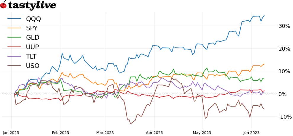 Fig. 1: Month-to-date price percent change chart for SPY, QQQ, TLT, UUP, GLD, and USO