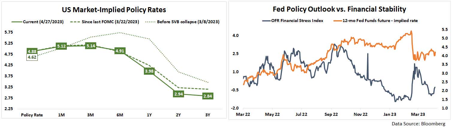 Softer data might have cheered markets as recently as a few months ago, when it could credibly stoke hope for a dovish adjustment in Fed rate hike odds. That seems to have stopped working. The priced-in policy path implied in rates futures has barely moved at all since the FOMC gathered for a its last meeting on March 22, just in the wake of the SVB-led banking crisis. Curiously, the standstill has persisted even as measures of credit stress returned to pre-crisis levels.