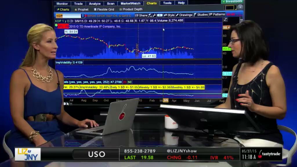 After looking at /CL, Liz and Jenny formulate a strategy in XOP, even though it has a poor IVR. The investors recognize a downward trend in the stock over the past couple of weeks. Therefore, they take on a directional assumption of a future upward movement and utilize a big lizard strategy. The duo does not think that the market will continue its depreciation, so the risk is to the downside with a big lizard position.