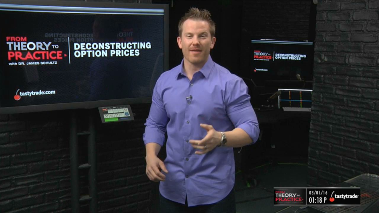 Option prices materialize from the option pricing models, such as the Black-Scholes, that we have all become at least somewhat familiar with. From these calculations, option prices can be boiled down to two pieces: the intrinsic value and the extrinsic value, or time value. The intrinsic value represents the current worth of the option, and the extrinsic value encapsulates all of the option’s risk. Intrinsic values can never be negative because the long option holder can simply walk away from the option if the underlying price moves against him, and time values must always be greater than zero (at least in theory) because there is always some amount of time left prior to expiration. Our core philosophy at tastylive is selling OTM options, so our primary focus is on managing and monitoring time values because OTM options by definition have no intrinsic values.