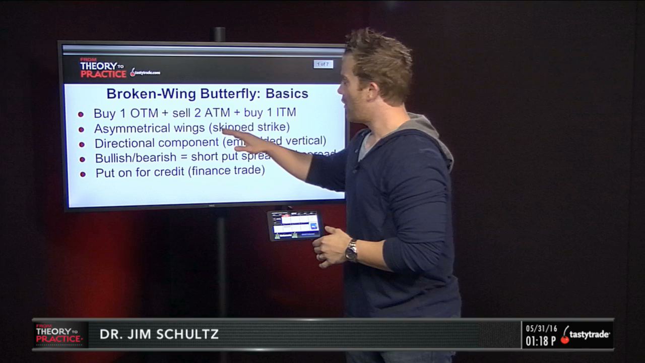 If you break the call side of the butterfly, then you’re adding a short call spread to the trade, and you will have a bearish bias on the trade. If you break the put side of the butterfly, then you’re adding a short put spread to the trade, and you will have a bullish bias on the trade. Your optimal scenario is still for the price of the underlying to pin the short strike. By putting the trade on for a credit and adding a directional component, you’ve now changed the risk dynamics. There will be no risk to the side of your directional bias, but more risk (relative to a regular butterfly) to the side away from your directional bias. Examples with SPY and AMZN are given during the segment.