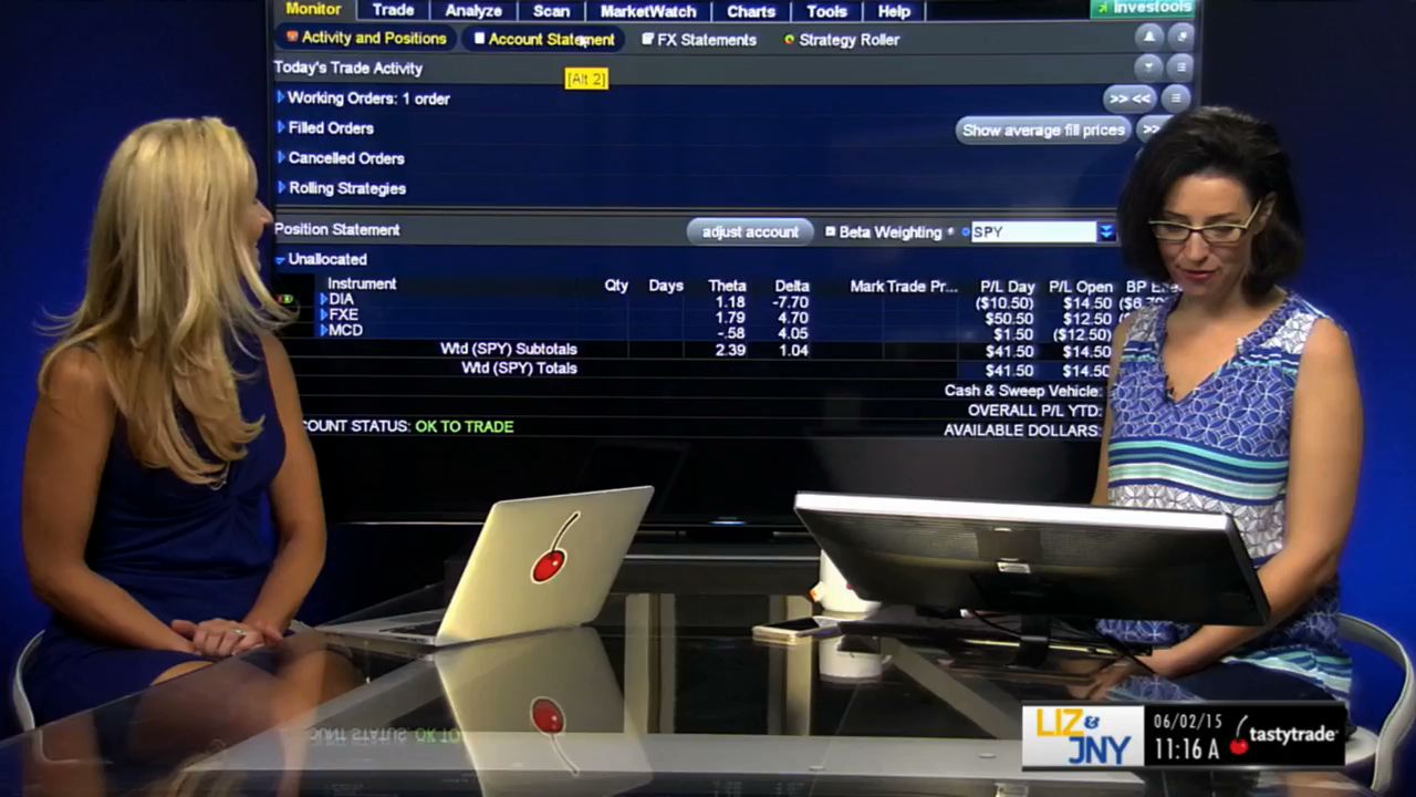 The trading companions walk the viewers through placing a big lizard in IYR. In addition, the ladies talk about the difference between a big lizard and a jade lizard. A big lizard is a straddle with a long call to define risk, where a jade lizard is a strangle with a long call to define risk.