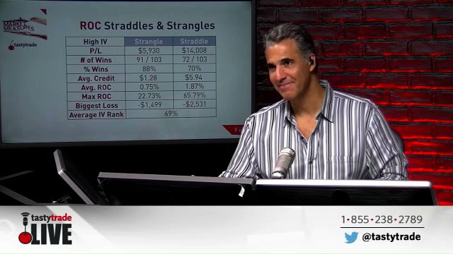 When looking to select an options trade, it is always important to know your Return on Capital (ROC). When looking at two trades that require nearly the same about of buying power (BP), the amount of credit that you can collect is a huge factor. That being said, is it better to collect a smaller amount of credit and keep all of it when trading a strangle (assuming the underlying stays between your shorts!) or should you sell a straddle, collect a larger amount of credit and hope the underlying doesn't move much so you can increase your overall profit?