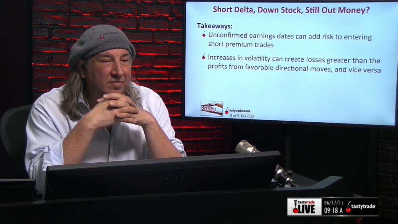 Unconfirmed earnings dates can add risk to entering short premium trades. Increases in volatility can create losses greater than the profits from favorable directional moves, and vice versa.
