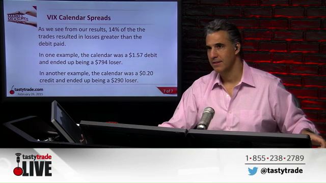 Tom S: Just remember, net P and L down. Based on the results, 14% of the trades resulted in losses greater than the debit paid. In one example, the calender spread was $1.57 and ended up being a $794 loser. Another example, the calendar spread was 20 cent credit, ended up being a $290 loser. I've actually seen way worse situations, but the takeaway from the segment is, with respect to VIX calendar spreads, that 14% of the trades resulted in losses greater than a debit paid. I have a lot of firsthand experience with this and the first thing we did… And these numbers are very accurate, because the first thing we did when we ran the brokerage firm was we went back and we studied…