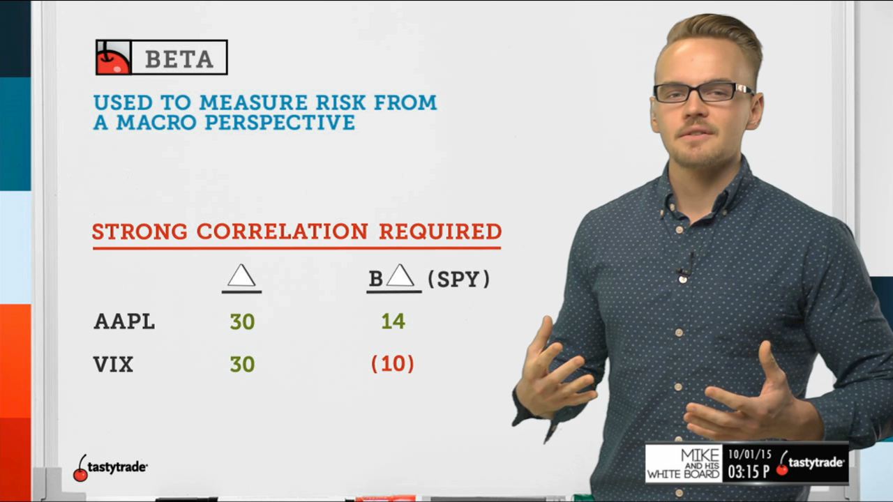 Mike explains beta, and how it can be used in options trading today on his whiteboard! He explains how beta requires a strong correlation to be useful, and gives you an idea of how long or short you really are with a particular position.