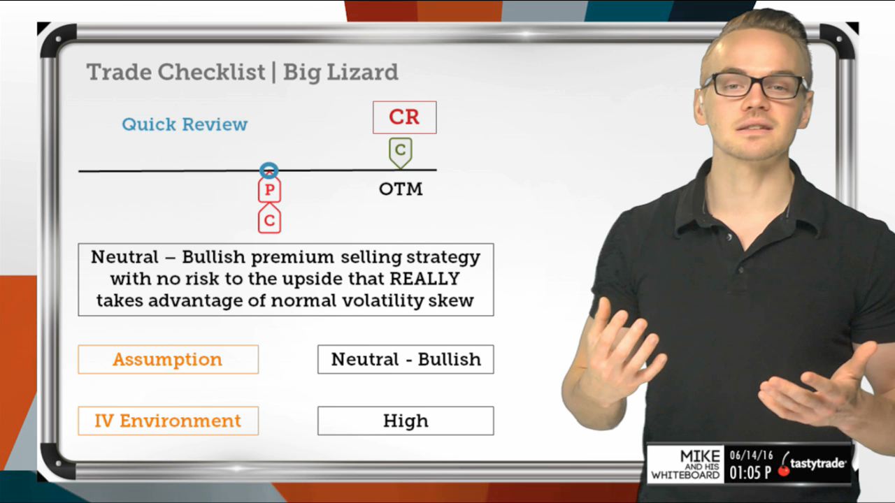 A big lizard is a strategy where we sell a straddle while buying an OTM call to eliminate risk to the upside when setup correctly. @doughTraderMike walks through his trade entry checklist and shows you what he looks for when placing this strategy!