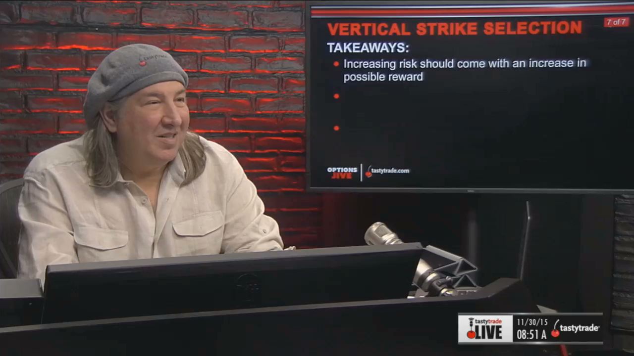 Watch this segment of “Options Jive” with Tom Sosnoff and Tony Battista for the takeaways plus other information on optimizing strike selection when using vertical spreads and comparing the increased potential profit to the increased risk ratio. This segment drives home the fact that there is no one optimal width as every position is unique.