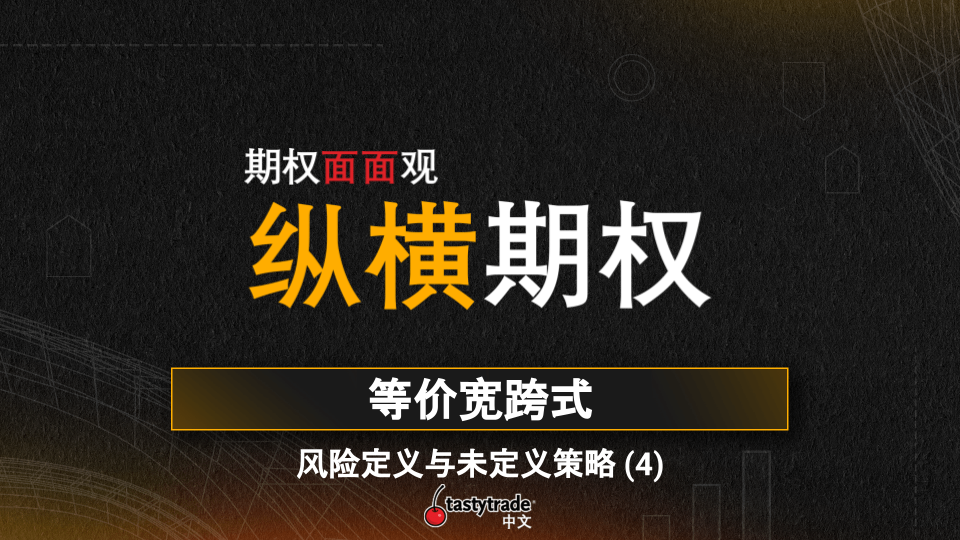 在“浅尝期权”系列当中,我们介绍过”等价替换策略”的概念。比如备对看涨组合和卖出看跌期权就是一对可以等价替换的策略。因为我们最近在介绍风险定义与未定义之间的关系,今天我们要提出一个类似的概念:等价未定义策略。那这次节目我们就来具体谈谈最常用的等价宽跨式。