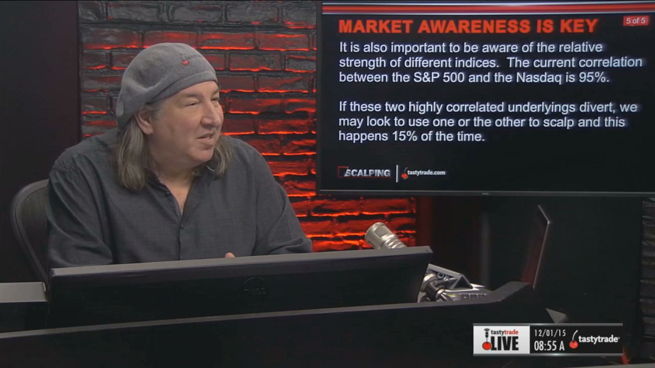 The current correlation between S&P 500 and the Nasdaq is 95%. It is important to be aware of the relative strength of each index. We may look to use one or the other to scalp should these two highly correlated underlyings divert. This happens 15% of the time.