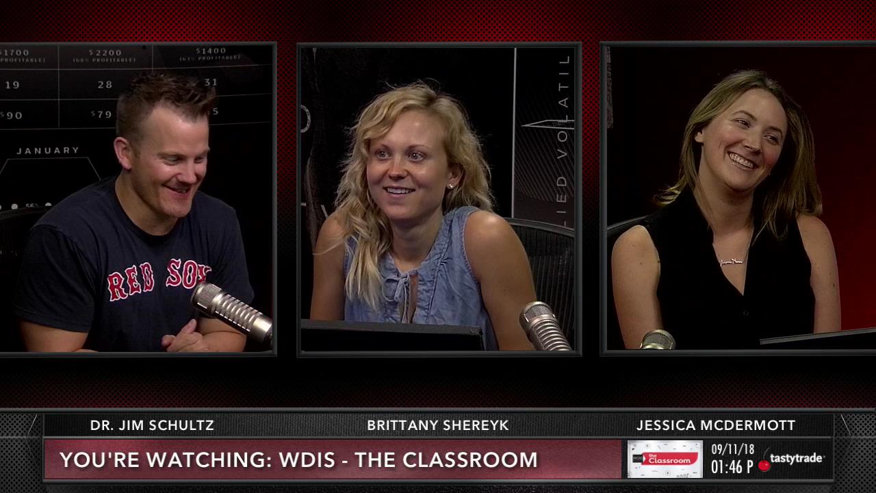 Today, with the classroom at full strength, we start by looking at Brittany’s Ratio Spread in GM. In doing so, we are reminded that there are two components to a Ratio Spread: a Vertical Spread and an extra Short Put. So, we manage her Vertical Spread at nearly max profit, roll out her Short Put, and add a Short Call to the position. In the end, we end up with an excellent, step-by-step guide for how to manage a Ratio Spread.